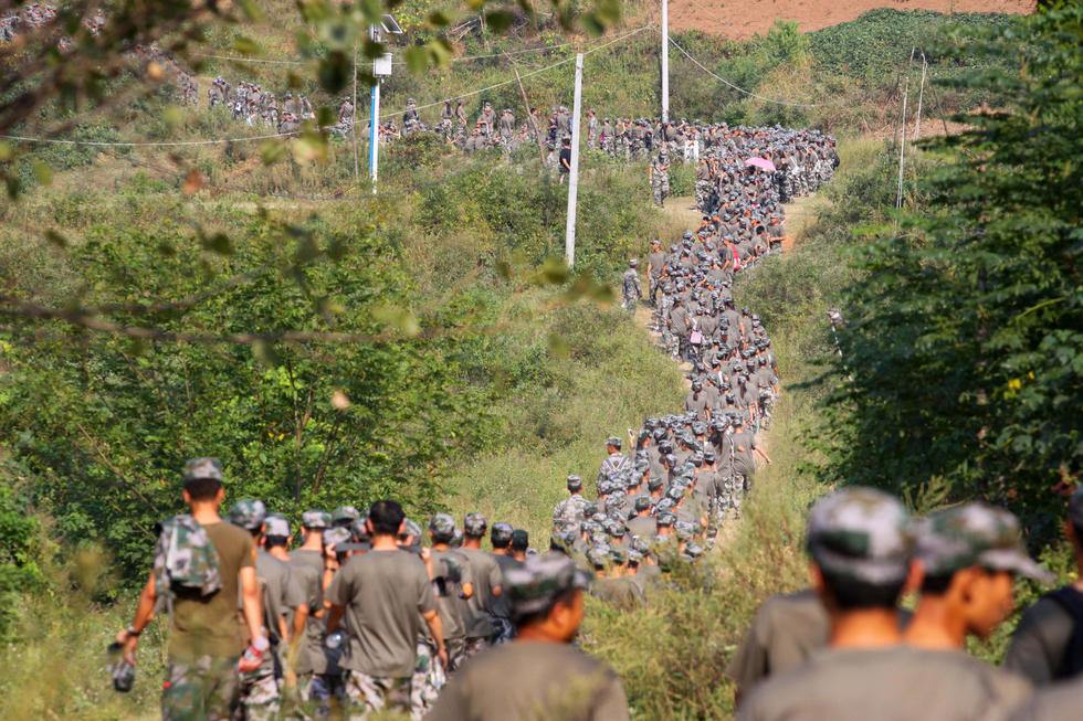 9月15日,湖北襄陽市,湖北文理學院近四千名大學一年級新生在隆中山上進行十公里拉練。