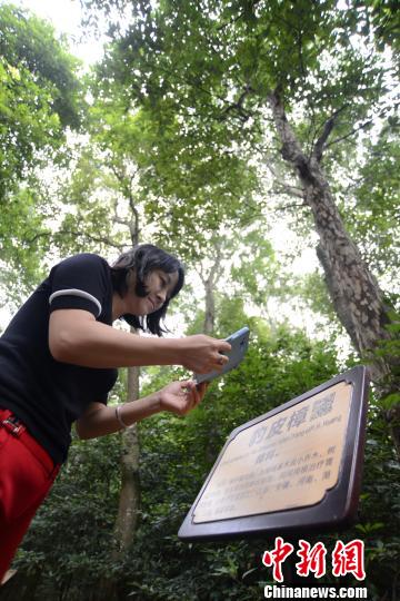 9月15日,在湖南郴州三合村古樹群內,游客在用手機掃描樹牌上的二維碼。 譚志文 攝