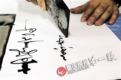 一把菜刀、一盆墨水,將紙放在平整的桌子上,寫字前用菜刀先在盆中攪一下,僅讓墨水吸附在菜刀三分之一的位置,然后手握菜刀,緩急有序地在紙上進行寫作。片刻,一個碩大而堅挺有力的“竹”字就出現在重慶晚報記者面前,重慶晚報記者看到,這個“竹”字,每筆每劃上都有細致的花紋,有些像使用菜刀切割的肉片,而“竹”字中的一豎,竹節赫然在目,看起來像幅水墨畫。