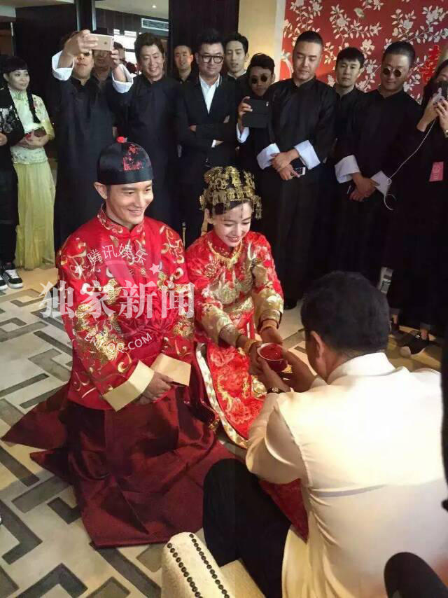 8日上午,黃曉明Baby舉行中式婚禮儀式,叩首、奉茶、拜天地,中式的婚禮禮儀總帶著濃濃的人情味。今晚17:30分,黃曉明和Angelababy將在上海展覽中心舉辦“世紀婚禮”。王思聰、小沈陽 、黃渤 、李云迪 、臺灣富少林昕陽等組成“伴郎團”;倪妮 、賭王女兒何超盈等擔任伴娘;王詩齡當花童。嘉賓很多,明星多達百人。