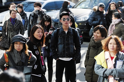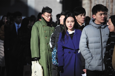 15日,中央戲劇學(xué)院,寒風(fēng)中考生在排隊(duì)等待進(jìn)入考場(chǎng)。