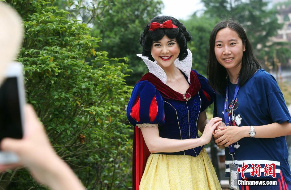 6月15日,離上海迪士尼開幕還有一天的時間,為期3天的上海迪士尼樂園開幕慶典系列活動吸引了近千名嘉賓前來感受迪士尼的無窮魅力。圖為“白雪公主”微笑迎客。湯彥俊 攝