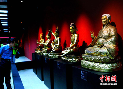“圣地西藏---最接近天空的寶藏”特展,6月30日在臺灣故宮博物院揭開面紗。這次展覽是臺灣歷年來規(guī)格最高、面向最完整的西藏文化與文物展,展出的130組件文物,來自西藏布達拉宮、羅布林卡等寺廟、西藏博物館、承德避暑山莊和北京民族文化宮等12處文物重鎮(zhèn)。整個展覽按“吐蕃王朝”、“金色寶藏”、“文化交流”、“雪域風(fēng)情”四部分布局展出,展覽9月19日結(jié)束。中新社記者 宋吉河攝