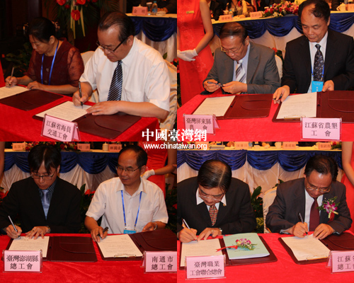 2009’江蘇·臺灣勞工研討會簽訂了4個蘇臺勞工交流合作協(xié)議,分別是:江蘇省總工會與臺灣職業(yè)工會聯(lián)合總會交流協(xié)議書、江蘇省農(nóng)墾工會與臺灣農(nóng)會交流協(xié)議書、江蘇省海員交通工會與高雄市交通運輸業(yè)工會聯(lián)合會總工會交流協(xié)議書、江蘇省農(nóng)墾工會與屏東縣農(nóng)會交流協(xié)議書。上圖為協(xié)議簽訂現(xiàn)場。(中國臺灣網(wǎng) 趙靜攝)