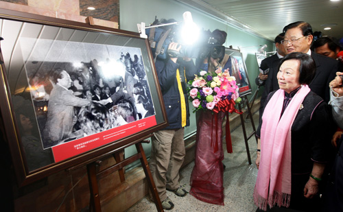 ;鶗 9日舉行19周年慶,;鶗麻L江丙坤(后右)與首任董事長辜振甫夫人辜嚴倬云(前右),一同觀看當年兩岸舉行汪辜會談的歷史照片 “中央社”圖