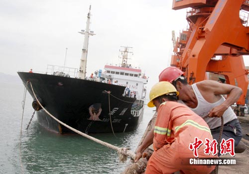 圖為碼頭工人牽引“寶洲”號瀝青船纜繩做好靠岸準備。肖咸強 攝