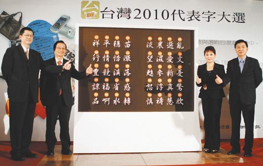 “臺灣2010代表字大選”活動,23日由“教育部長”吳清基(左二)、聯(lián)合報總編輯羅國俊(左)、SOGO董事長黃晴雯(右二)及律師黃茂德(右)共同公布40個候選字。