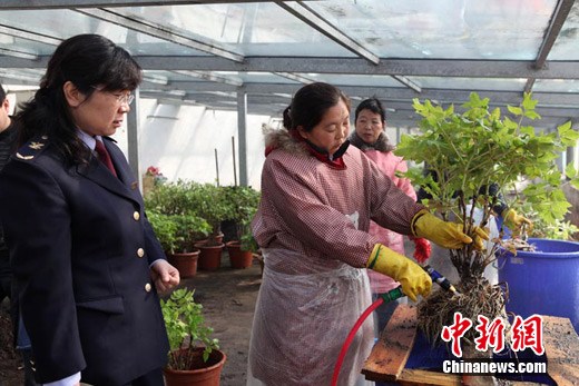 洛陽(yáng)出入境檢驗(yàn)檢疫局工作人員正在對(duì)參展牡丹生長(zhǎng)情況進(jìn)行觀察。