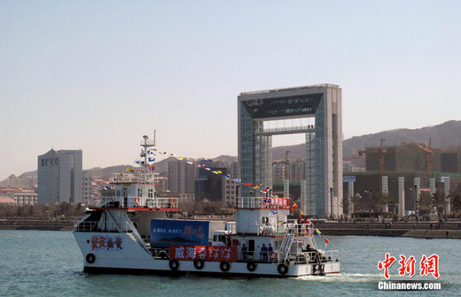 臺(tái)灣梅花鹿和長鬃山羊16日抵達(dá)威海機(jī)場,隨即經(jīng)緊湊的陸地、海上運(yùn)輸?shù)巧蟿⒐珝u。圖為專門搭載兩對(duì)“寶貝”的登陸船行進(jìn)在威海灣。劉舒凌 攝