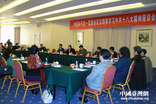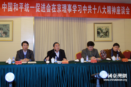 中國臺灣網(wǎng)11月23日北京消息 23日下午,中國和平統(tǒng)一促進會在北京友誼賓館召開在京理事學(xué)習(xí)中共十八大精神座談會,來自黨政部門、新聞媒體、科教、經(jīng)濟、文化藝術(shù)等界別的25位理事出席座談會。