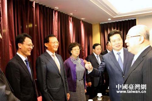 青島市委李群書記在臺北向吳伯雄榮譽主席介紹青島團(tuán)中的企業(yè)家。