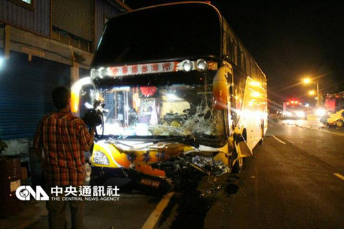 一輛陸客團游覽車16日晚間和自小客車相撞。(臺灣“中央社”)