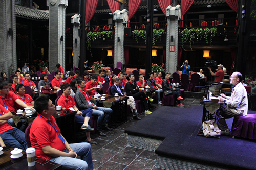 研習(xí)營(yíng)一行首先參觀了武侯祠與錦里。在武侯祠,來(lái)自四川大學(xué)歷史文化學(xué)院的著名三國(guó)歷史文化專(zhuān)家方北辰為營(yíng)員們上了一堂特殊的“商業(yè)課”。方教授以《諸葛亮出山之謎》為題,從商業(yè)運(yùn)作、人才培養(yǎng)等角度重新解讀了“劉備三請(qǐng)諸葛亮”這一大家耳熟能詳?shù)臍v史故事,給營(yíng)員們帶來(lái)了不一樣的三國(guó)文化體驗(yàn)。方教授講完后,意猶未盡的營(yíng)員們踴躍提問(wèn),與方教授熱情互動(dòng),現(xiàn)場(chǎng)掌聲、歡笑聲絡(luò)繹不絕。