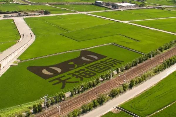 這塊彩色稻田是阿里巴巴通過“我的一畝田”計劃認養的。不同于阿里巴巴彩色稻田的廣告味,而在苗栗的苑里農會則是以熊貓為主題,制作出的彩色稻田,5只熊貓組成的熊貓家庭圖案(右圖上),模樣逗趣溫馨。游客可以登上稻田旁3層樓高的觀景臺,飽覽彩色稻田的景致。