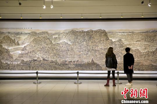 12月27日,觀眾在臺(tái)北孫中山紀(jì)念館內(nèi)觀展。《水墨家園──李小可作品展》近日開幕,共展出包括古都遺韻、雪域藏跡、山水黃山和師法自然等系列的75幅作品。 陳小愿 攝