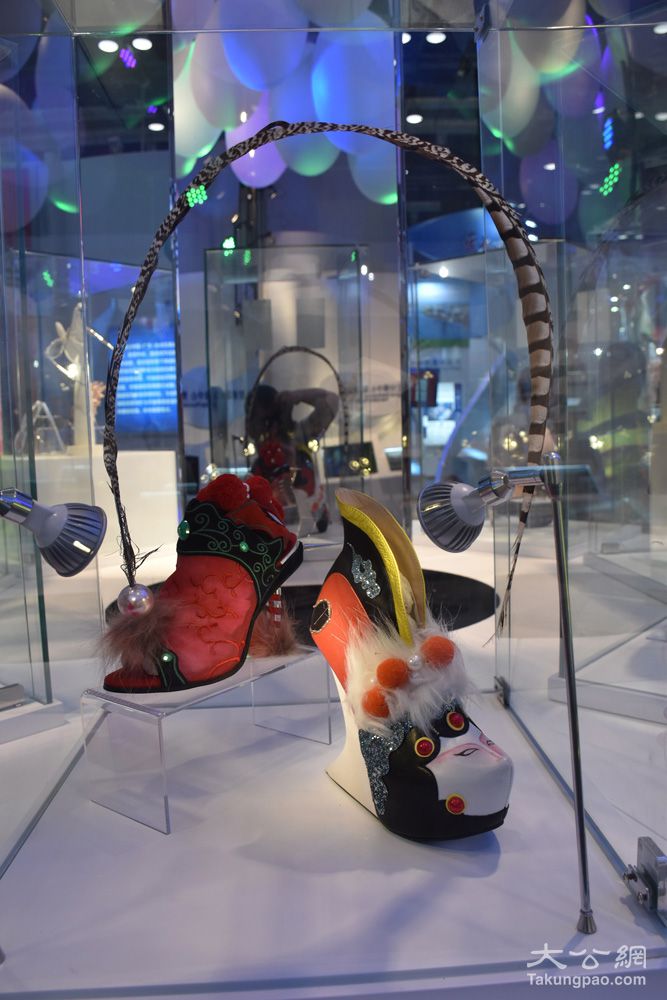 圖:香港展區內一雙京劇臉譜風格的高跟鞋/大公報記者張寶峰攝