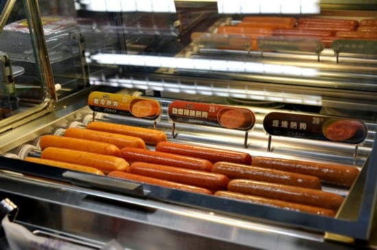 在大陸見到的臺式烤腸,就是那種在烤腸機上轉呀轉,等熟了后拿根竹簽一穿,舉在手里就可以吃的香腸。