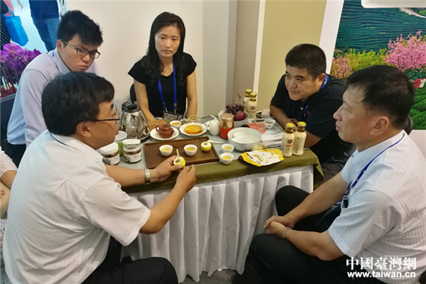 農(nóng)交會(huì)期間,各臺(tái)創(chuàng)園的臺(tái)農(nóng)與農(nóng)業(yè)部相關(guān)部門負(fù)責(zé)人在臺(tái)灣展區(qū)溝通交流。(中國(guó)臺(tái)灣網(wǎng) 郜利敏 攝)