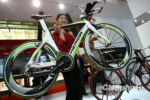 5月27日,由臺北世界貿(mào)易中心組織的臺灣精英企業(yè),以臺灣精品館形式隆重亮相第十三屆中國北京國際科技產(chǎn)業(yè)博覽會。展中,剛當(dāng)選“2010臺灣精品獎”的金、銀質(zhì)獎佳品和多達(dá)29家臺灣精品廠商的產(chǎn)品也亮相于眾。圖為一位女士輕松的用單手舉起一輛盡重9KG的自行車。 中新社發(fā) 富田 攝