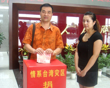 圖為同樣在今年“莫拉克”臺風中遭受重大損失的溫州銳鋒礦山有限公司董事長鄭昌黎在為臺灣災區人民捐獻3000元愛心款。(中國臺灣網 浙江臺辦聯合報道)