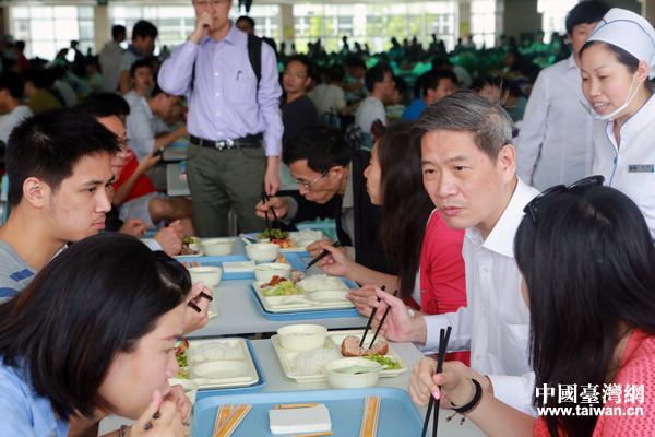 中國臺灣網5月15日杭州消息 中共中央臺辦、國務院臺辦主任張志軍15日中午來到浙江大學,與在這里就讀的臺灣學生一同排隊打飯,并在食堂餐敘。(中國臺灣網記者于斯文)