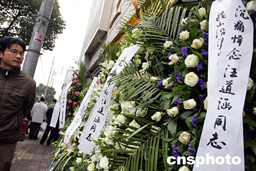 上海龍華殯儀館大廳今天莊嚴(yán)肅穆,大廳門楣上懸有黑色橫幅,上書:“為汪道涵先生送行”,兩邊的挽聯(lián)上寫著:申江水闊百年初現(xiàn)鴻圖愿,海峽月圓萬里同懷碩儒風(fēng)。數(shù)百只潔白的花圈環(huán)繞于大廳內(nèi)外,汪道涵先生遺體靜臥于靈臺(tái)上,白色和粉色的鮮花簇?fù)碇?