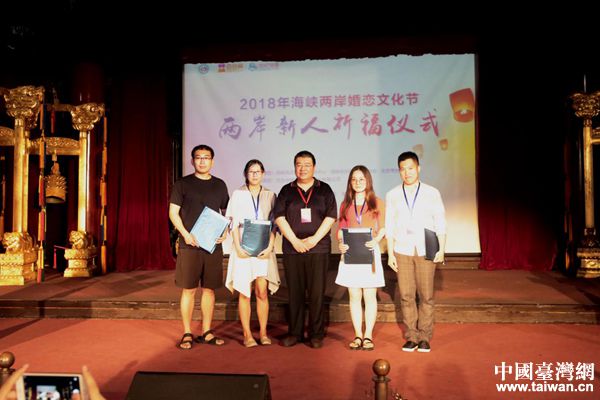中國慈善聯合會秘書長助理陳冬青為兩岸新婚配偶代表贈送禮品(中國臺灣網 王莉婷攝)