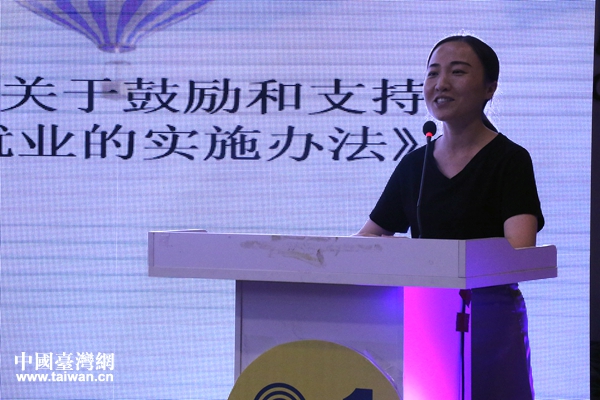 福州市臺(tái)辦經(jīng)濟(jì)處副處長(zhǎng)徐嫻向大家講解“66條實(shí)施意見”。(中國臺(tái)灣網(wǎng) 張露露 攝)