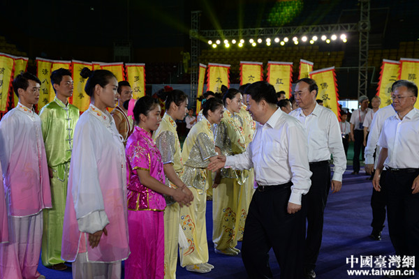 國務院臺辦副主任龍明彪等人與參加武術表演人員握手。(圖片來源:河北臺辦)