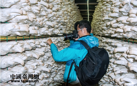 采訪團深入生產(chǎn)廠房了解杏鮑菇生長情況。(圖片來源:四川省臺辦)