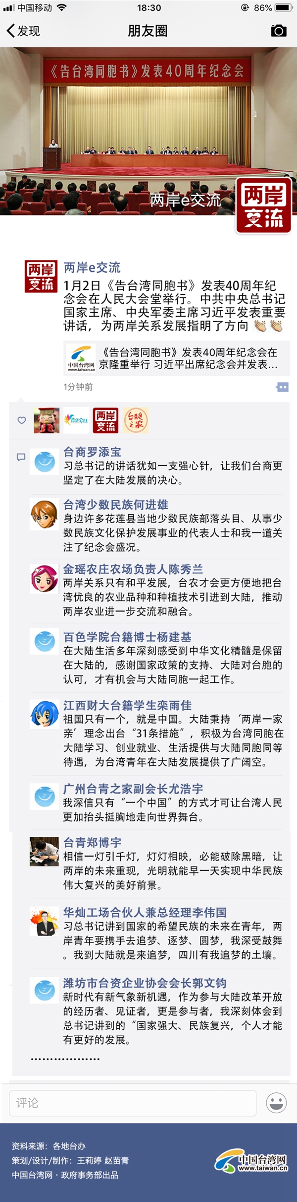 中國臺(tái)灣網(wǎng)1月4日訊 1月2日,《告臺(tái)灣同胞書》發(fā)表40周年紀(jì)念會(huì)在人民大會(huì)堂舉行。中共中央總書記、國家主席、中央軍委主席習(xí)近平發(fā)表重要講話,科學(xué)回答了在民族復(fù)興新征程中如何推進(jìn)祖國和平統(tǒng)一的時(shí)代命題。講話在臺(tái)胞、臺(tái)商之間引起熱烈反響,他們紛紛表示,講話鼓舞人心,堅(jiān)定了臺(tái)胞在大陸發(fā)展的信心,為兩岸關(guān)系發(fā)展指明了方向。