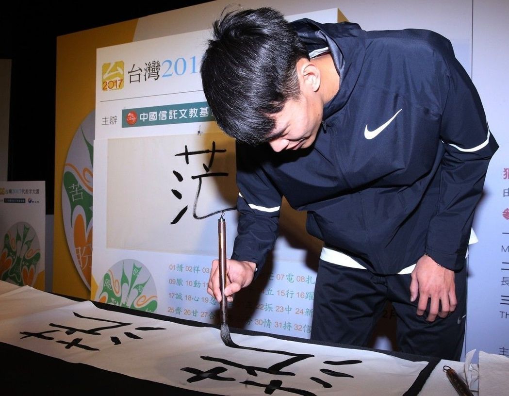 陳奎儒用毛筆寫下臺灣2017代表字“茫”。(圖片來源:臺灣《聯(lián)合報》)