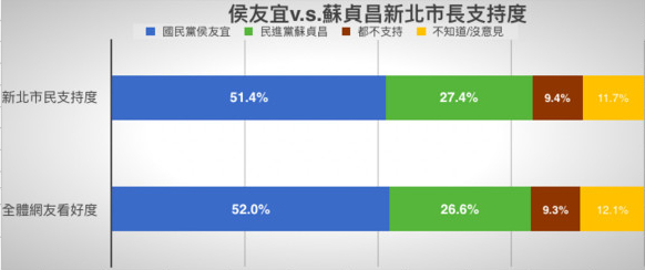 調查結果顯示,民進黨年底如果推派蘇貞昌出征對決侯友宜,侯友宜在新北市依然能拿下51.4%的支持度,遠勝蘇貞昌的27.4%;此外,如果是游錫堃出征,恐怕也討不到便宜,侯友宜依然拿下53.6%支持度,大勝游錫堃的28.2%。