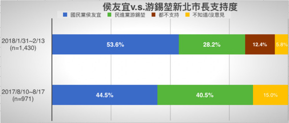 據報道,針對2018新北市長爭霸戰,“東森新聞云”于今年1月31日至2月13日便啟動“新北市長選情大調查”。調查分析發現,設籍于新北市的民眾,不管侯友宜對上任何民進黨對手,即便是“天王級”人物,都能拿下超過50%的高支持度。