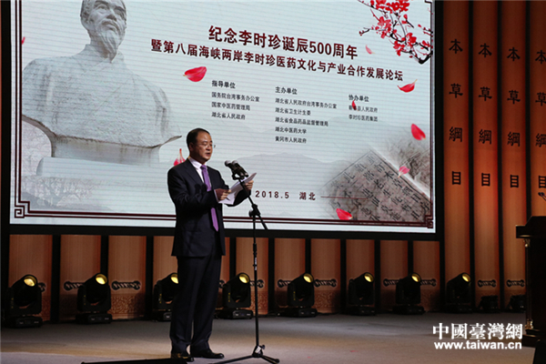 中國臺灣網5月25日武漢訊 (記者 郜利敏)李時珍誕辰500周年暨第八屆海峽兩岸李時珍醫藥文化與產業合作發展論壇25日上午在湖北武漢舉行。湖北省委常委、省委統戰部長爾肯江·吐拉洪,臺灣海基會前副董事長、中國國民黨大陸事務部前主任高孔廉等領導和嘉賓出席論壇,湖北省臺辦主任李建紅主持論壇。300名來自兩岸中醫藥領域的學者、專家、企業家齊聚一堂,共同緬懷李時珍,共話中醫藥文化及產業發展。
