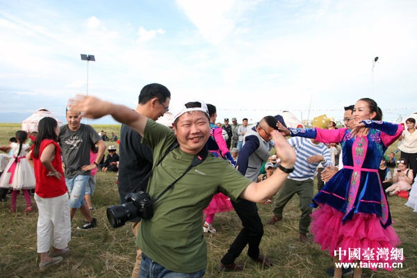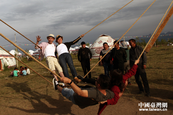 臺灣90后攝影師楊東霖(右者)體驗哈薩克族秋千。(中國臺灣網 王怡然 攝)