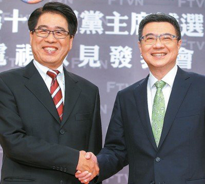 民進(jìn)黨黨主席補(bǔ)選昨天舉行電視政見(jiàn)發(fā)表會(huì),候選人卓榮泰(右)和游盈隆(左)先握手致意。(圖片來(lái)源:臺(tái)灣《聯(lián)合報(bào)》)