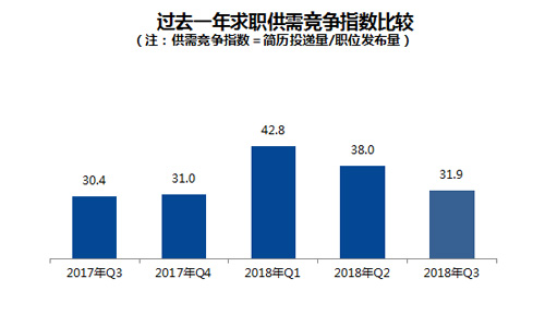 報告顯示,2018年秋季求職期全國人才供需競爭指數(供需競爭指數=收到的簡歷投遞量/發布的職位數量)為31.9,這意味著在全國范圍內平均每31.9人競爭一個崗位,競爭激烈程度趨緩,但競爭指數同比上升。