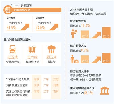 在出行旅游方面,今年“十一”黃金周期間,航空、鐵路、公路及與自駕相關的加油等交通出行類日均消費金額同比增長近五成;賓館住宿類日均消費金額同比增長近六成!皣鴳c長假是出行旅游的高峰期,加上近期全國大部分地區天氣晴好、溫度適宜,進一步提升了老百姓的出行熱情!敝袊y聯數據分析師陳漢表示,“河南、遼寧和吉林等地是交通出行類日均消費總量同比增長最快的地區!
