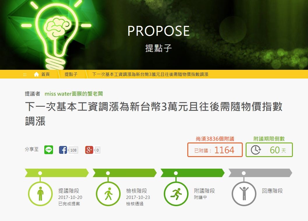 提案更寫道,臺灣低薪問題已嚴重到間接造成了少子化問題產生,因為薪水少了民眾都不敢生育了。而往年的基本工資調漲都無法有效解決困境,故才會提議一次大幅拉高基本工資至3萬元,“屬合理甚至還過少”。