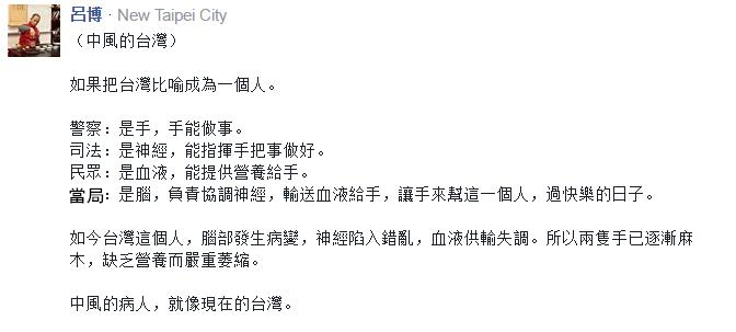 打擊犯罪、維護治安是警察的天職,但也需要各方的配合,可7萬的臺灣警察如今不僅難逃被民進黨政治陰謀戕害的命運,本該護己有利司法系統也有崩壞的危機……誠如臺灣網友所形容的,若將臺灣比作“一個人”,那么如今的臺灣因蔡當局的繆政和操弄已經變成一個“中風的病人”了。
