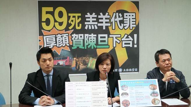 去年國(guó)民黨“立院”黨團(tuán)舉行記者會(huì),要求創(chuàng)下“任職7個(gè)月中兩岸59人死于大巴事故”駭人記錄的賀陳旦下臺(tái)。(臺(tái)媒圖)