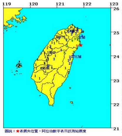 據(jù)報道,根據(jù)“氣象局地震測報中心”資料,各地最大震度宜蘭縣南澳5級、花蓮縣和平4級,3級地區(qū)包括:宜蘭縣宜蘭市、南投縣合歡山;2級地區(qū)有:新北市坪林、花蓮縣花蓮市、桃園市三光、臺北市信義區(qū)、臺北市、新北市、臺中市德基、新竹縣竹東、苗栗縣三義、云林縣草嶺;1級地區(qū)有:基隆市、桃園市、新北市萬里、新竹市、新北市石門、新竹縣竹北市、苗栗縣苗栗市、臺中市、南投縣南投市、彰化縣彰化市、嘉義縣阿里山、云林縣斗六市、嘉義市、臺東縣長濱、臺南市新化。