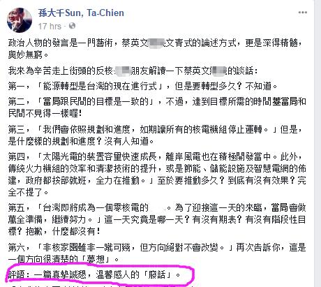 孫大千在文章中不僅逐一反駁了蔡英文發帖的內容,更直言,蔡英文口中的“非核家園”方向絕不會改變,只是再次告訴大家“這是一個方向很清楚的‘夢想’”。