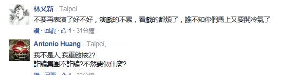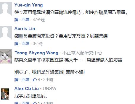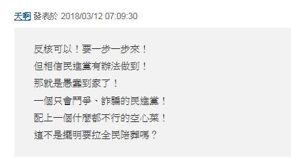 更有耿直的網友直接把矛頭對準蔡英文,“(廢核)還不如直接廢蔡英文比較快”、“老在空中畫餅,把臺灣人當傻子耍”。