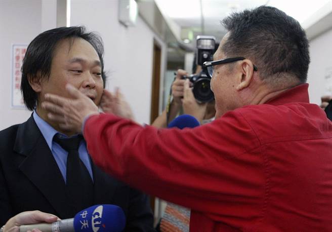 2005年,王世堅(jiān)不滿李敖言論影響個(gè)人名譽(yù),到李敖辦公室要找他理論,兩人在走道上展開言語辯論,李敖摸著王世堅(jiān)的臉頰說“小老弟,不要再鬧了,肚子餓了,趕快回去吃飯吧!”(圖片來源:臺(tái)灣《中時(shí)電子報(bào)》)