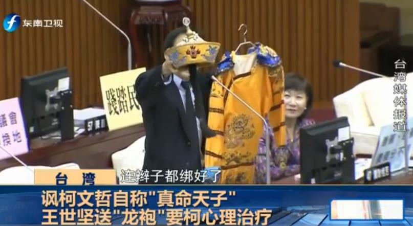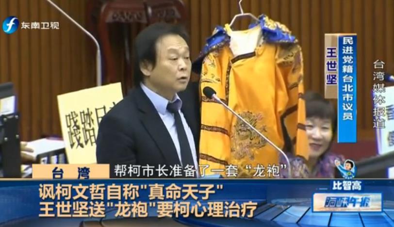 王世堅與柯文哲互懟早不止一兩次,情緒激動的王世堅也是不斷鬧出笑話。據東南衛視報道,柯文哲10日赴議會施政報告,王世堅拿出“龍袍”“龍帽”,說要送給自稱“真命天子”的柯文哲,引起全場哄堂大笑。王世堅說:“幫柯市長準備了一套‘龍袍’,讓柯市長私下在辦公室或在家里可以穿上它過過癮,這也算是一種心理治療”。他還勸說柯文哲,“送給自稱‘真命天子’的你,你就別客氣了,收下吧。”