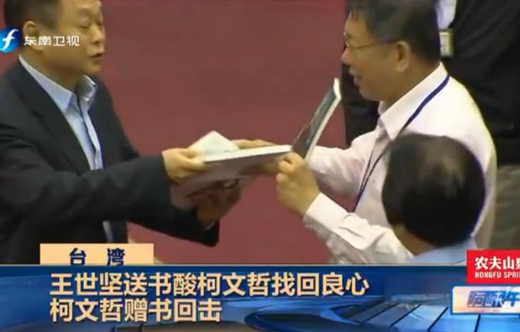 王世堅與柯文哲互相贈書。(圖片截取自東南衛視視頻)
