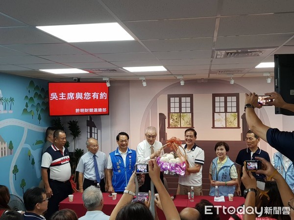 吳敦義到國民黨提名的新竹市長參選人許明財競選總部輔選。(圖片來源:臺灣“東森新聞云”)