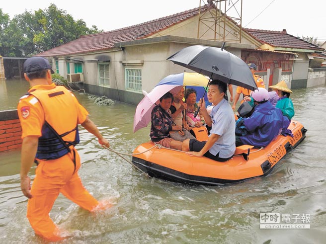 臺南北門區玉港里水淹過膝,多名高齡長者受困屋內出不了門。(圖片來源:臺灣“中時電子報”)